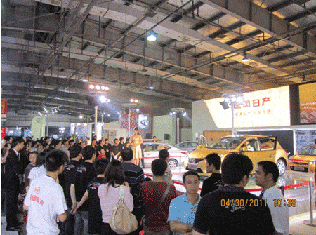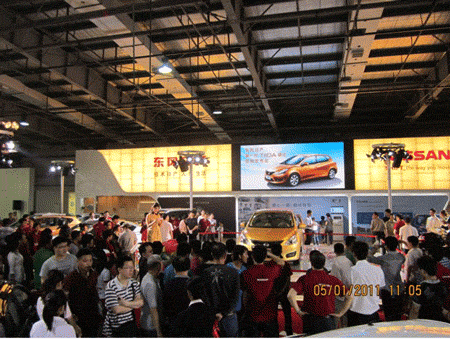 此次车展,无论是从参展的展具规模,还是展地面积,东风日产都是全场最耀眼的焦点:国际标准的D级展具,架具自带的灯光与音响设备,占地504平米,空高近6米,拥有全场最大的LED视频,车用旋转舞台、智能感应式灯光、超大液晶屏、独立洽谈室一应俱全。东风日产旗下各车型在璀璨的灯光下散发着无穷魅力,吸引了众人的目光。展场上全明星阵容大放异彩,而其中全新天籁和新一代骐达的表现更是卓越出众。展台上最撼动眼球的莫过于主持人引领酷男靓女车模对东风日产全车型进行实时全方面现场展示表演,从中级车到城市SUV,从旗舰家轿到高级商务用车,热烈活泼的舞台表演让观众在车展现场饱尽了眼福,真正感受到了东风日产的卓越品质。现场最激动人心的就归订单数莫属了,通过下定拍照张贴在“风云榜”上,不但能够激励销售顾问积极性,更能够为购车客户起到督促购车、导向的作用。