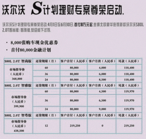 【泉州驾校网www.0595jx.com讯】本站新手购车栏目小编近日从泉州鸿海沃尔沃4S店了解到:即日起至6月30日,首付8万元起,即可坐拥新款沃尔沃S80L2.0T智尚版和智雅版车型。感兴趣的朋友可前往泉州鸿海沃尔沃4S中心亲身品鉴及试驾,购车即可享受这一超值金融优惠政策。