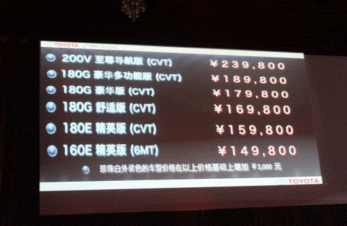 6月22日,广汽丰田逸致正式上市,本次上市的车型有1.6L、1.8L、2.0L三种排量共6款车型,分别是:160E精英版,180E精英版,180G舒适版,180G豪华版,180G豪华多功能版,200V至尊导航版,售价区间为14.98-23.98万元。其中1.8L分别设有5座版和7座版。颜色有珍珠白、香槟金、钨金灰、云母蓝、水晶银和紫钻黑6种可供选择。