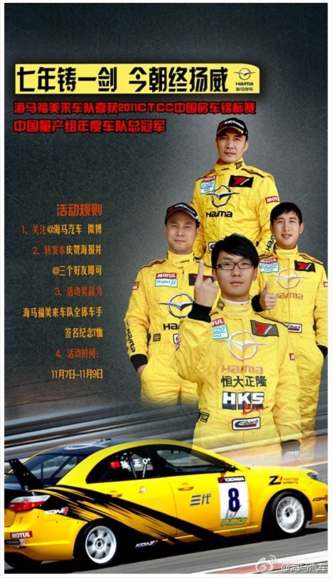 七年铸一剑,扬威剑出鞘!从2005年到2011年,从探路者福美来323到小钢炮欢动再到福美来三代,海马汽车,一步一脚印,书写着新的传奇!福美来车队CTCC总冠军荣耀,有属于您的一份!11月7日---9日,转发本夺冠庆贺微博并@三名好友,和我们一起分享夺冠的喜悦,海马福美来车队全体车手签名纪念T恤等你拿!
