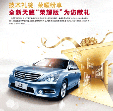 全新天籁势头强劲,全新天籁荣耀版强势登场,该车搭载微软+英特尔定制嵌入式Windows操作系统、3D+3G高性能双导航系统、320G多媒体娱乐中心、场景高保真倒车影像系统等多项尖端科技配备,纷呈驾享乐趣,尽在一席掌控!