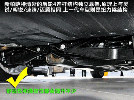 从2000年初开始Passat B5的时代一直延续到了2011年初,基于第五代帕萨特车型的上海大众帕萨特领驭在底盘结构上都未曾发生变化,始终如一的使用着扭力梁式半独立悬架,如今看来这套悬架系统已经太过时了。新帕萨特在底盘结构上的最大改变就是后悬架的提升,4连杆独立悬架搭配到新帕萨特上,这套悬架系统已经被应用在了PQ46平台的迈腾、斯柯达昊锐上,所以如此看来新帕萨特至少拥有一部分PQ46平台的血统。多连杆悬架在应对路面侧向和纵向力的时候都有更多的发挥空间,尤其是后排乘客会感觉到乘坐更加的舒适。