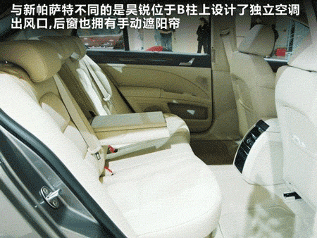 斯柯达昊锐与新帕萨特明显不同的是在座椅设计上更加注重乘坐的舒适性,至少在造型上已经不那么突出对乘员的包裹感。同时在B柱向后的方向还特别设计了针对后排乘客的空调出风口,这一配置也是对最求舒适的车主有着较高的吸引力。此外,还有后排手动遮阳帘和车顶平直的线条设计,都让昊锐的后排空间表现并不逊色与轴距尺寸占优势的心帕萨特。