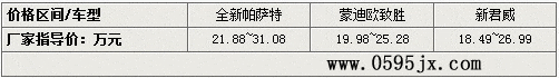 【泉州驾校网www.0595jx.com讯】本站新手购车栏目小编有话:车主在购买B级车的时候会考虑什么?先进的科技,宽敞的空间还是优异的动力性。在B级车中各家都在上面配备了更多的舒适配置和强劲动力,下面小编就带大家来对比一下全新帕萨特,福特蒙迪欧致胜,别克新君威,看看它们在哪些细节方面有着差别。
