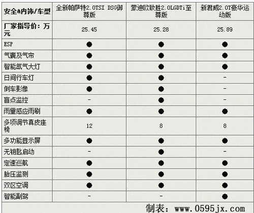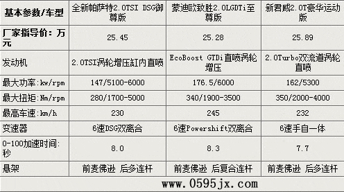 从上表看出,在三家厂商的B级车价格还是有一定的差距,致胜价格相对较低。由于各款车都有不同的型号,配备了不同的动力总成,所以我们从三款车中各选取同为2.0T并且价格在25万元到26万元之间的3个车型。