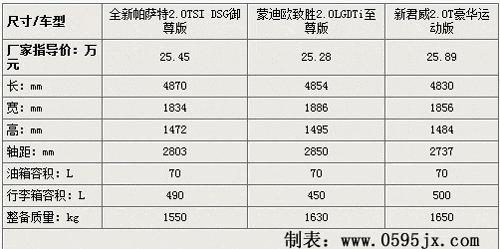 车辆尺寸方面全新帕萨特虽说轴距小于致胜但车长是三款中最长车宽略小的,所以外形上更显修长,三者油箱容积倒是保持了惊人的一致,所以加满油所用费用也就近乎一样。不过做为B级长,虽说在数据上看上去会有不小的差距,但在实际乘坐中这些差距并不是那么明显。对于一款B级车尺寸并不是决定购买的主要差异。