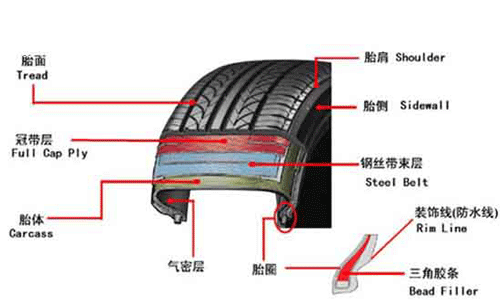 轮胎是汽车上的重要零部件,看上去很简单的轮胎其实很复杂。轮胎有多种分类,目前常见的充气轮胎有斜交胎和子午胎两种,它们是根据胎体帘布的贴合形式不同而分别命名的。下面我们以轿车常用的子午胎为例,了解一下它的结构: