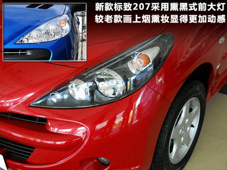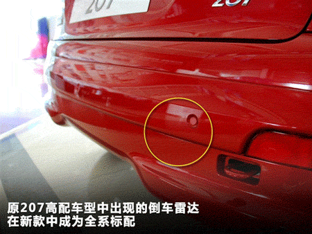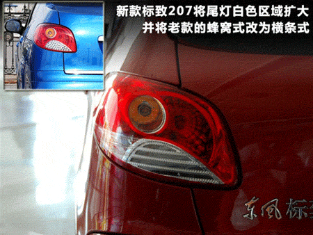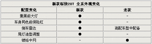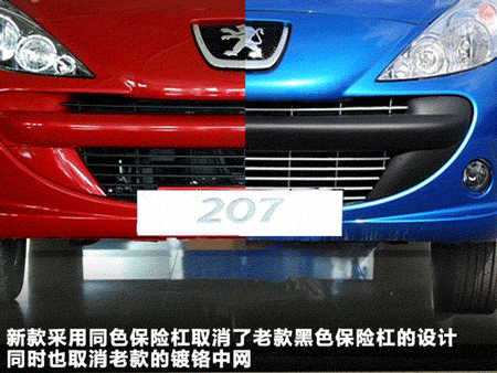 新款款标致207前保险杠采用了车身同色的设计取消了之前黑色保险杠,层次感个人感觉没老款分明,但同时也取消了镀铬中网。原本柳叶式大灯也被熏成黑底,符合时下潮流的元素,尾部主要是对尾灯进行更改,将原来尾灯的白色区域扩大,并将蜂窝式改为横条式,现在2010款东风标致207两厢高配车型中的倒车雷达,新款东风标致207改为全系标配。