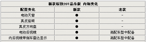在内饰变化上改款207在品乐版的基础上增加电动天窗、真皮座椅、电动调节后视镜、真皮方向盘、后视镜带倒车雷达显示的功能,价格在老款的基础上,高配车型中配置了电动后视镜。改款车型增加了这项配置改为全系标配。后视镜带倒车雷达显示的功能,也改为品乐版标配。