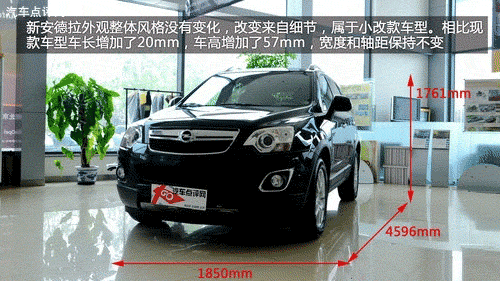 新安德拉外观整体风格没有变化,改变来自细节,属于小改款车型。相比现款车型车长增加了20mm,车高增加了57mm,宽度和轴距保持不变,车身长宽高分别为4596mm、1850mm、1761mm,轴距达到2707mm,顶部的行李架设计提升了整体的跨界特性。