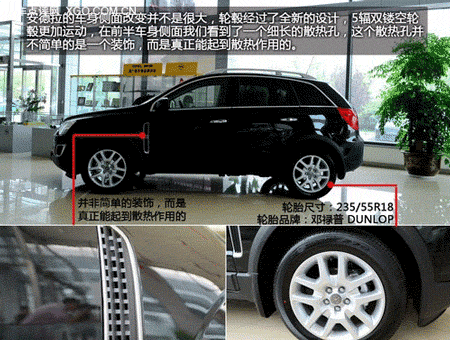 安德拉的车身侧面并不是很大,轮毂经过了全新的设计,5辐双镂空轮毂更加运动,235/55R18的轮胎尺寸没有发生变化,在前半车身侧面我们看到了一个细长的散热孔,这个散热孔并不简单的是一个装饰,而是真正能起到散热作用的。