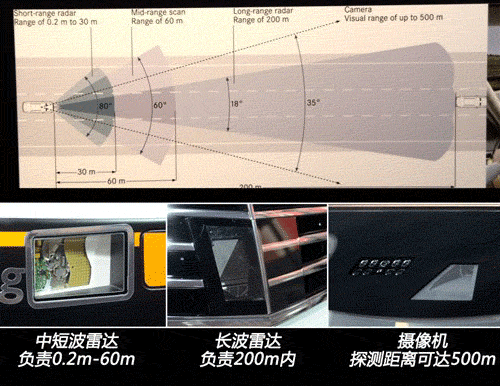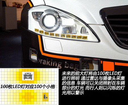 目前装备LED光源的车型已经越来越多了,不过多数情况下我们只是把它当做日间行车灯或刹车灯,而真正能用其照明的车型还并不多。ESF车型的远光灯由100枚LED发光元件组成,系统通过计算可以选择性的开启或关闭发光元件。当迎面来车时系统可以自动关闭照射到对方车辆上的LED灯,而当路边有行人时系统会自动识别,并用闪烁的光源分别提醒路人和司机。雷达系统则是已经应用在S级和E级上的技术,系统通过不同波段的波对车辆四周进行扫描以实现限距跟车等功能。比较遗憾的是,引入国内的该系统都将取消短波雷达,主要原因是其短波雷达使用的频率与我国军方相同,所以被禁止大范围的使用。