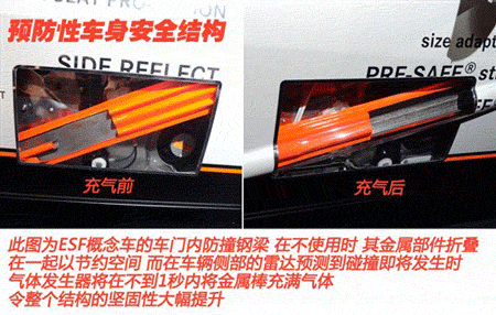 预防性车身安全系统同样很有看点,位于车门内的防撞钢梁平时处于折叠状态,而当车辆侧部的雷达感应到侧向碰撞不可避免的时候,一套气体发生器将会在不到1秒内产生10-20巴的压力,从而将防撞梁充满。充满气体的防撞梁可以承受高达100公斤的冲击力,但相对来说却节省了大量的体积和质量。