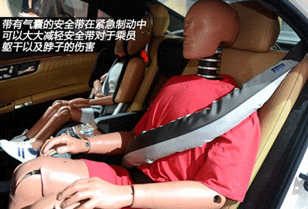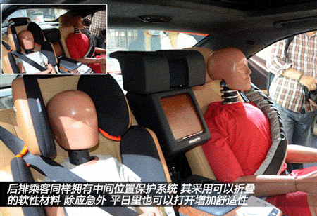 后排乘客同样享有座位间的保护系统,不过其并没有使用气囊,而是通过一组可以折叠的软性材料实现,其优点是可以反复使用,甚至日常也可以使用,而缺点则是打开速度较慢,在事故来临时可能无法及时到位。安全带气囊则是为避免安全带对于乘员的伤害而设计,其可以明显降低安全带对于乘客躯干、脖子的伤害。