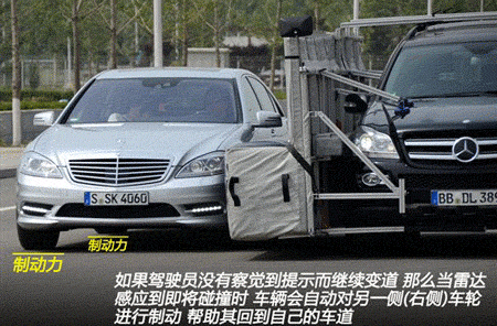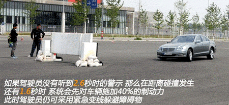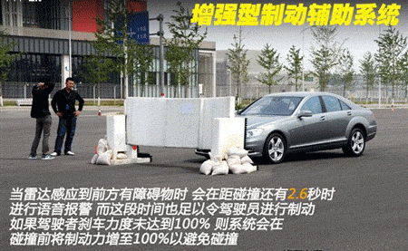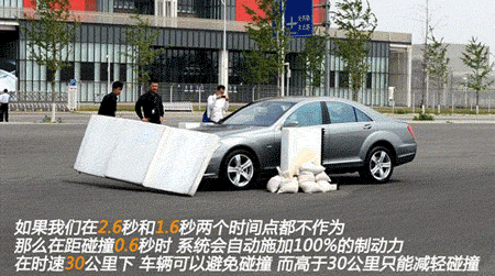 制动辅助系统和很多品牌的自动刹车系统基本相同,奔驰的该系统共分为3个阶段,在距离碰撞2.6秒时会进行语音的提醒,而在1.6秒时则会施加40%的制动力予以提醒并减速,如果驾驶员仍无反应,系统会在碰撞发生前0.6秒时施加100%制动力以减小损失。30公里的速度内可以避免碰撞,与沃尔沃相同。