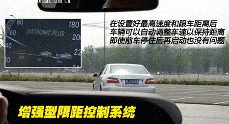 奔驰所搭载的限距控制系统功能比较强大,其可以按照预先设定的车速与跟车距离做自动调整,即便前车停住再启动也没有问题。另外在车辆转弯时,后车也能够很好的识别前车并自动跟随。这点似乎只有沃尔沃的跟车系统可以匹敌。