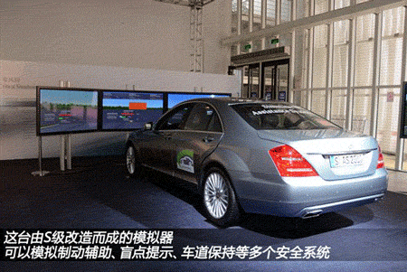 此次技术沙龙的展厅里还放着两台可以参与体验的大型模拟设备,其中由一辆S级改装而成的模拟机人气最高,其可以模拟上页提到的几乎所有的主动安全技术,这让不能试驾的我们总算找到了一点安慰。