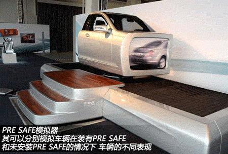PRE-SAFE模拟器主要模拟在紧急制动下,带有PRE-SAFE功能的车型与没有该系统车型的区别。装备有PRE-SAFE的车型在碰撞发生前的一秒会自动将安全带束紧并将座椅位置调整到碰撞时最安全的角度。看似不起眼的小动作在实际事故中会有很大的影响,模拟器很生动的阐述了一个结论,即同样系安全带,乘员坐姿以及安全带表现的不同也会让结果产生很大的不同。