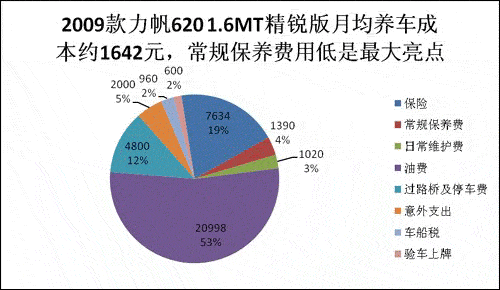 09款力帆620 1.6MT精锐版每月养车成本=(960+1020+4800+2000+600+7634+1390+20998)/24=39402/24=1642元