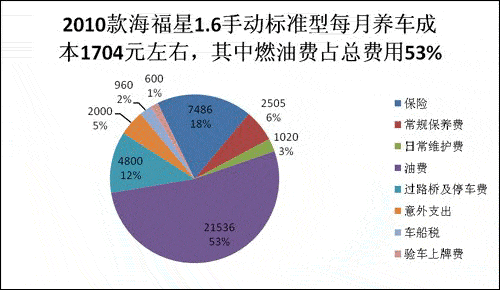 2010款海福星1.6手动标准型每月养车成本=(960+1020+4800+2000+600+7486+2505+21536)/24=40907/24=1704元