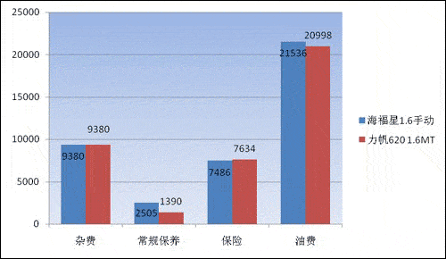 由上表可以看出,2010款海福星1.6手动标准型和09款力帆620 1.6MT精锐版两车前五项支出(车船使用税、日常维护费、过路过桥和停车费、意外开支以及上牌验车费)分别共计9380元;09款力帆620 1.6MT精锐版除了全额保险比2010款海福星1.6手动标准型略高以外,常规保养费用和燃油费都具有明显的优势。