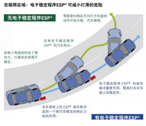 说原理,其实ESP是ABS系统的扩展功能,在车上增加不少传感器,用来检测汽车是否失控的危险,再通过电脑发出命令,让车子主动地单独制动某个车轮,让车子稳定下来。