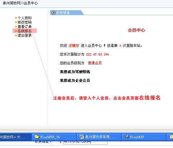 二、 注册后请输入您的用户名及密码登入泉州驾校网个人会员管理页面,点击在线报名,如图所示: