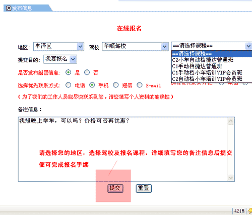 三、 请认真选择您想要报名或咨询的驾校,选择优先联系方式及备注信息后提交系统,如图所示: