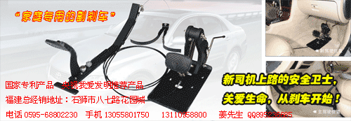假如您是刚刚取得驾驶证或是久未驾车的“老司机”,还在为有驾照不敢上路开车而烦恼,就请来试试新型的专利产品“家用副刹车”,买一套没多钱,租一套也挺好。自带保险锁止装置,用时可以打开,不用时可以关闭。